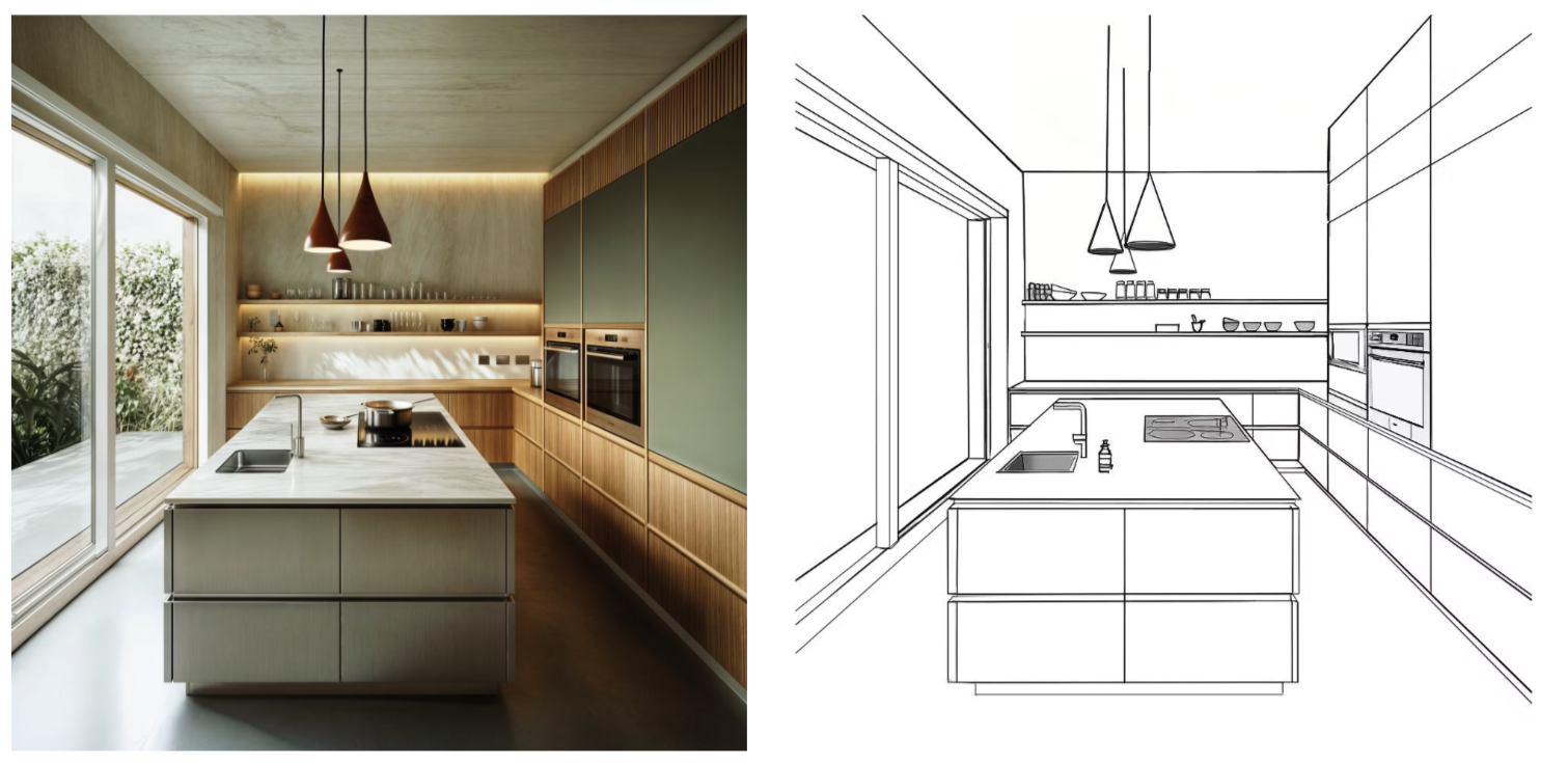 AI can manage with a relatively simple "control image." The reference image ensures that AI accurately represents our project and not a whimsical view. This can be a schematic 3D, a sketch, or even a crumpled paper!