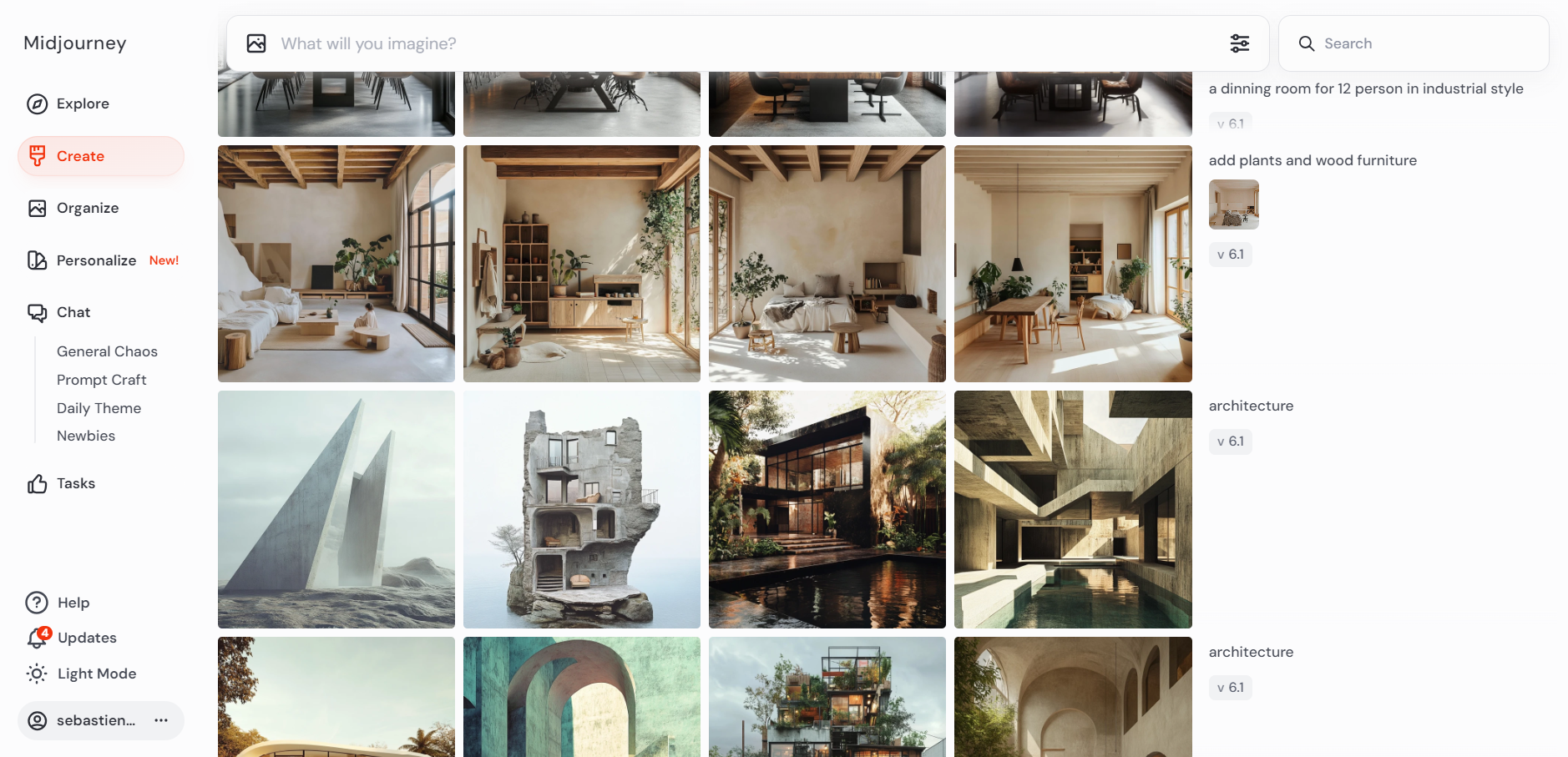 It's also easy to create variations or start from another userâs prompt. There is indeed a shared image gallery that you can draw from. Even though architectural images are not very numerous and often overly stylized, there are good examples for inspiration.
