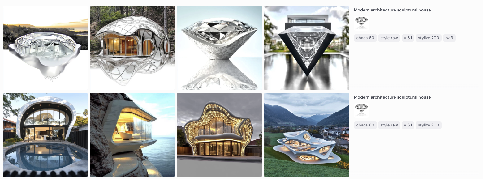 Si par exemple dans cet exemple, je combine un diamant et un prompt simple "modern architecture sculptural house", je peux avoir une combinaison des deux idées.